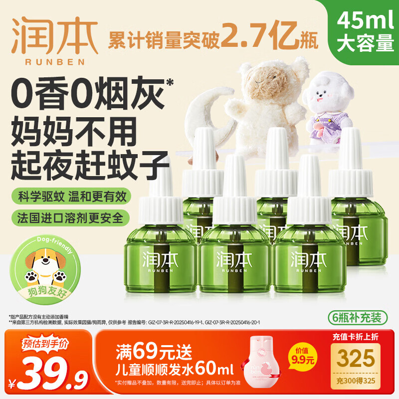 润本蚊香液电蚊香液驱蚊液45ml*6瓶驱蚊防蚊补充装(无蚊香加热器)