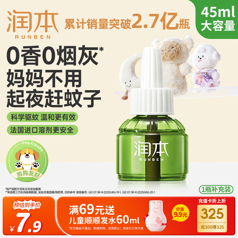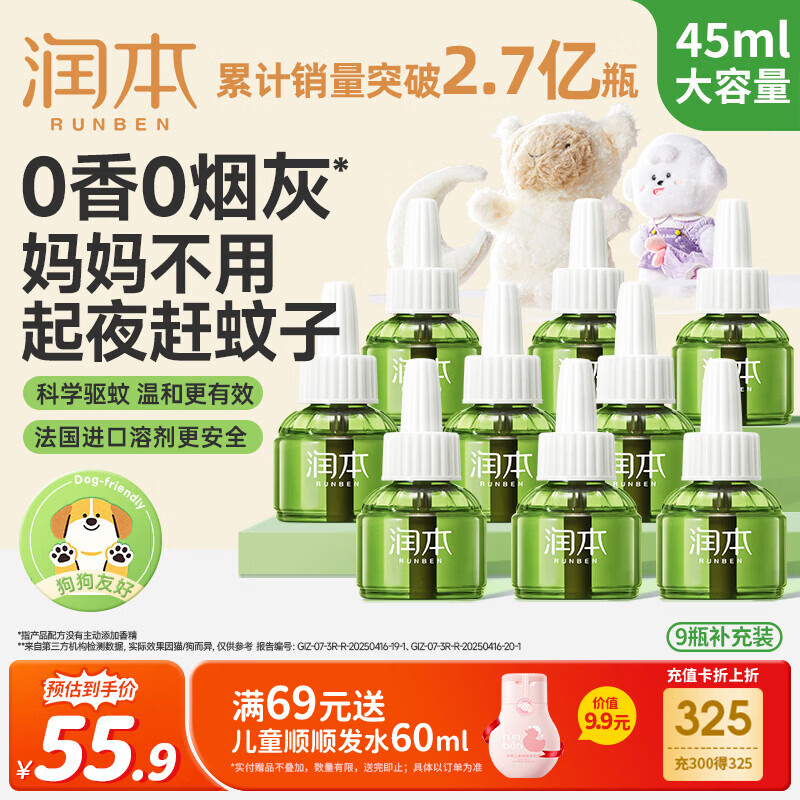 润本蚊香液电蚊香液驱蚊液45ml*9瓶驱蚊防蚊补充装(无蚊香加热器)