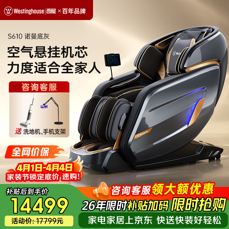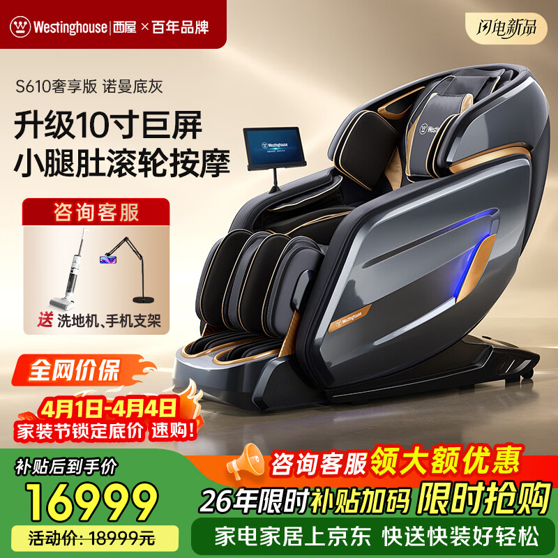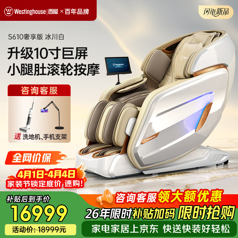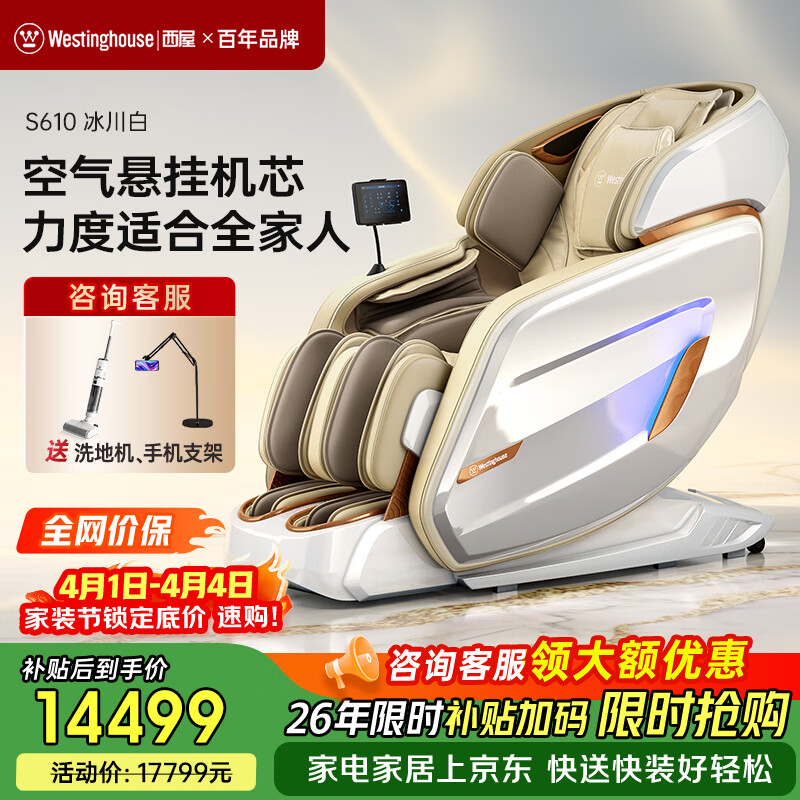 西屋(Westinghouse) S610家用智能电动按摩椅【CE认证】女王椅2026全身揉捏太空舱沙发椅S620升级款送老人生日礼物 S610奢享版 冰川白【升级小腿滚轮】