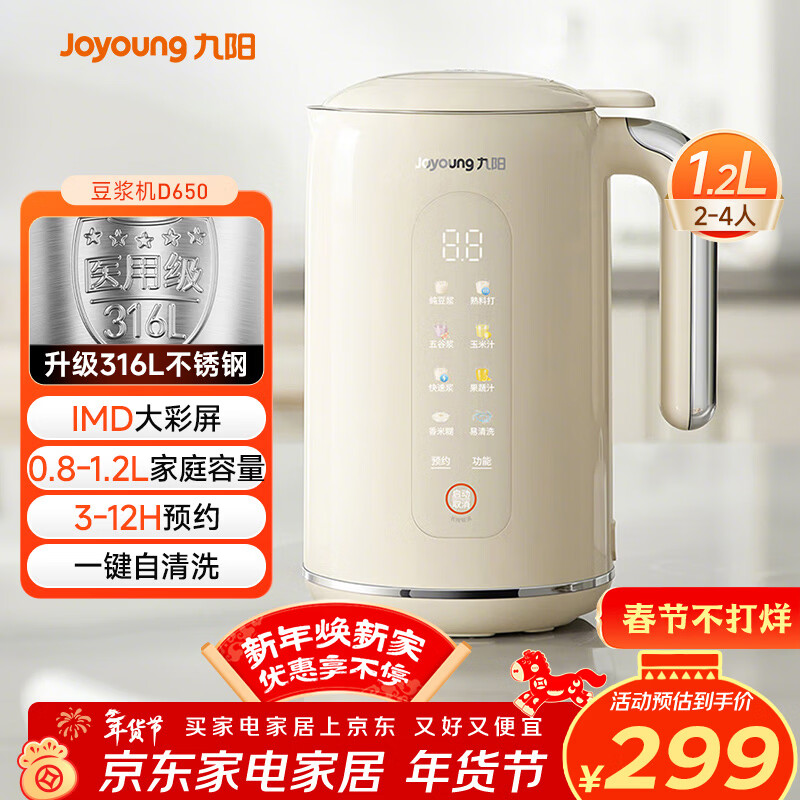 九阳(Joyoung)破壁机0.8-1.2L豆浆机 IMD彩屏可预约2-4人用易清洗家用全自动料理机榨汁机D650