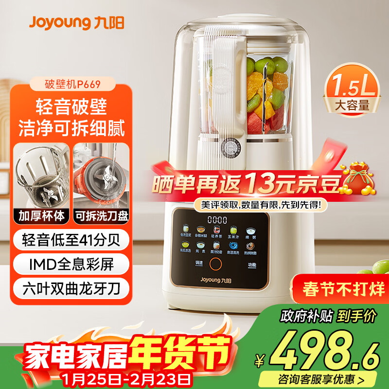 九阳(Joyoung)1.5L低音破壁机家用全自动豆浆机轻音45分贝2-4人降噪榨汁料理机五谷杂粮破壁机 P688 国家补贴