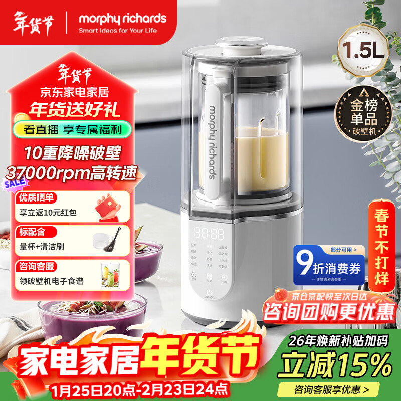 摩飞电器(Morphyrichards)破壁机 家用1.5L多功能柔音豆浆机加热全自动榨汁机搅拌机 3-4人预约保温隔音降噪辅食机MR8201白
