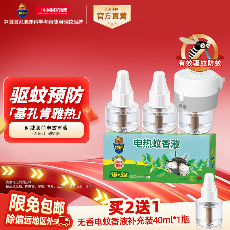 超威电蚊香液基孔肯雅热灭蚊器无香驱蚊防蚊液165晚补充液3瓶1加热器