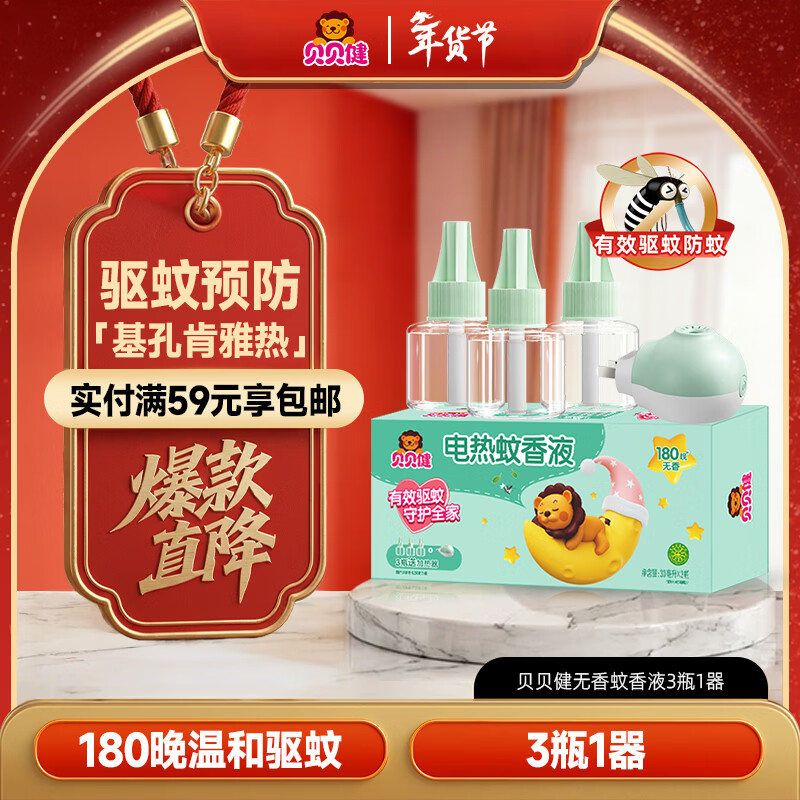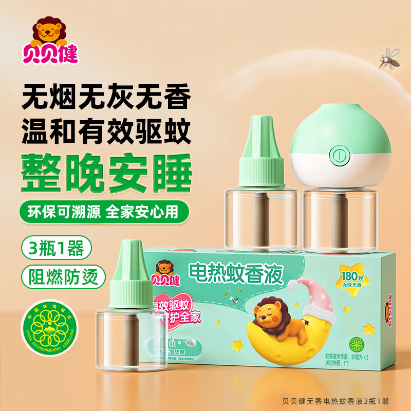 超威贝贝健电蚊香液基孔肯雅热无香驱蚊防蚊液180晚补充液3瓶1加热器