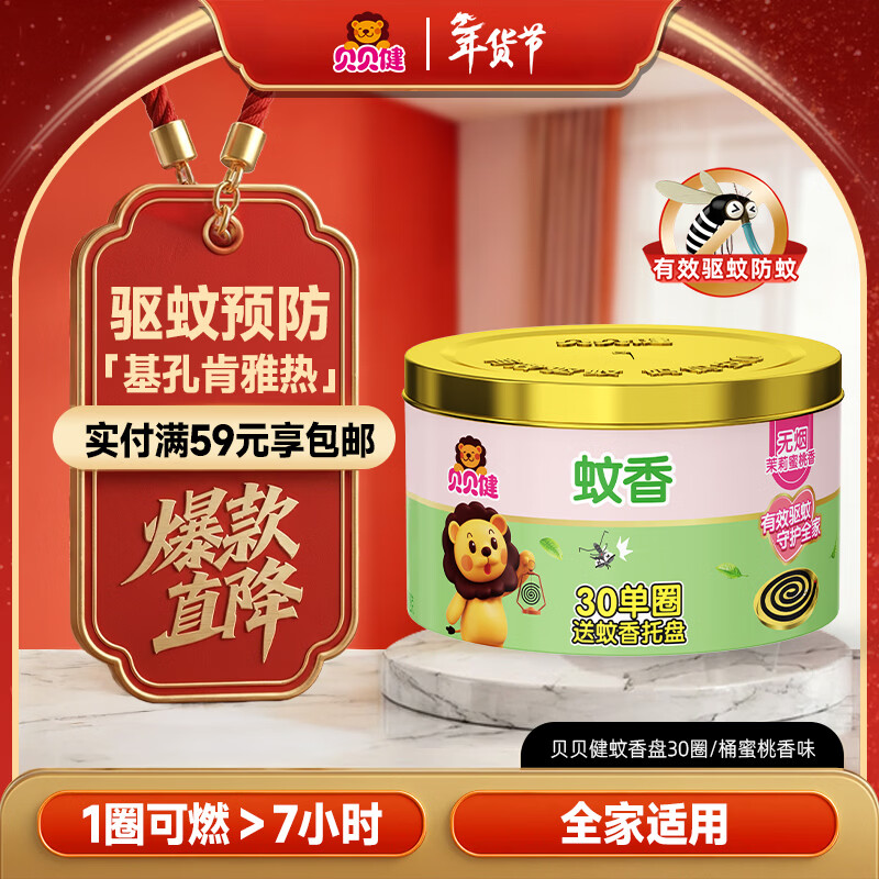 贝贝健超威蚊香盘30圈*1盒 全家可用室内防蚊驱蚊盘香无烟蜜桃清香