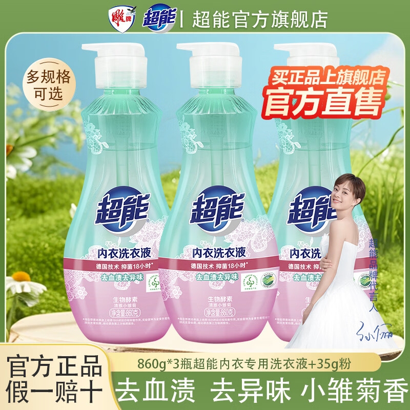 超能内衣洗衣液内衣裤专用清洗液大瓶洗衣液去血渍去味抑菌除菌旗舰 【送35g粉】860g*3瓶超能内衣专用洗衣液