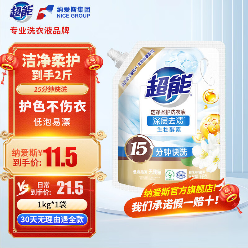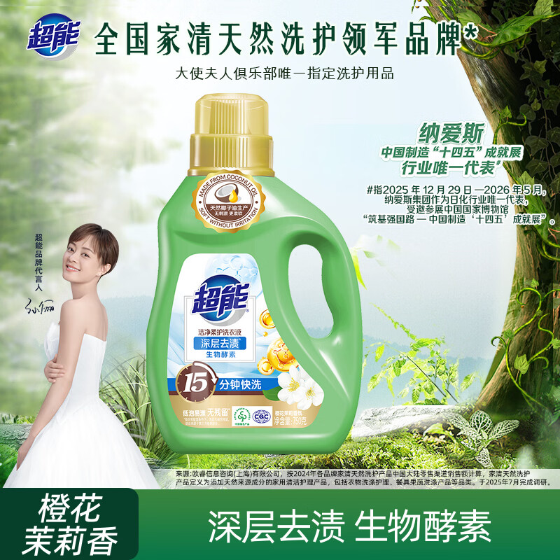 超能 洁净柔护(鲜艳亮丽)洗衣液 橙花茉莉香 1kg*1袋 15分钟快洗