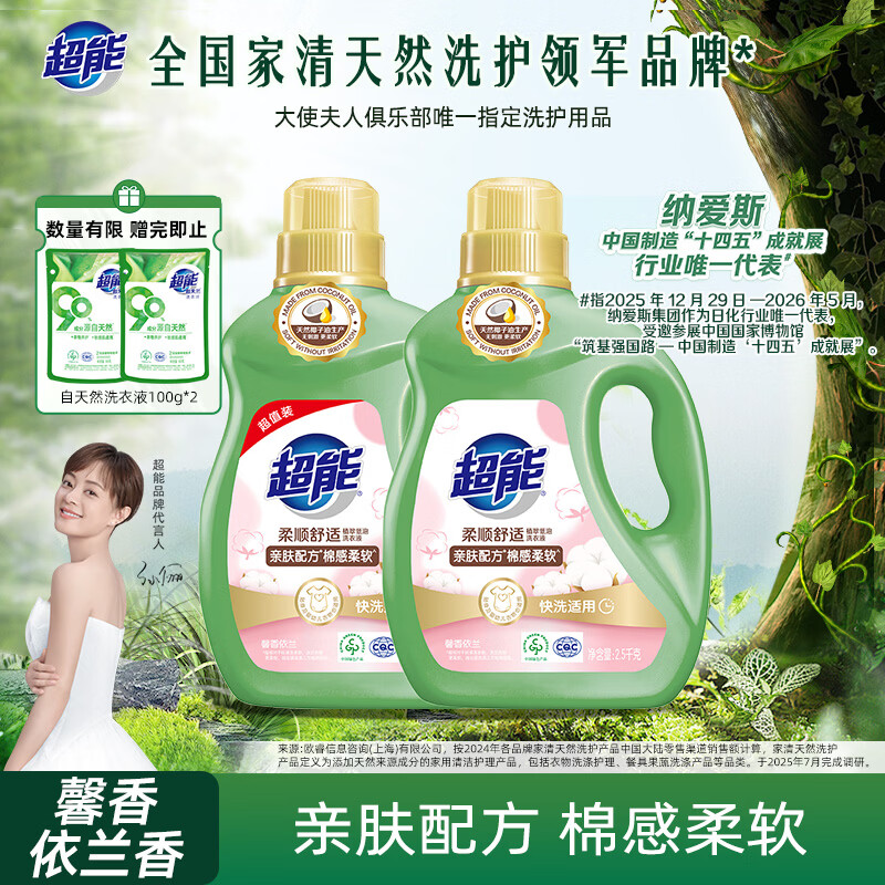 超能 柔顺舒适洗衣液 馨香依兰 2.5kg*2瓶 天然椰油 生物酶 高效去污
