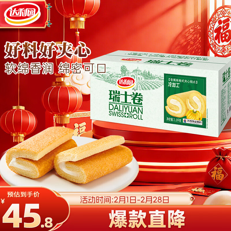 达利园瑞士卷散装多口味早餐面包零食糕点心蛋糕休闲食品 香蕉味【约600g】 30枚