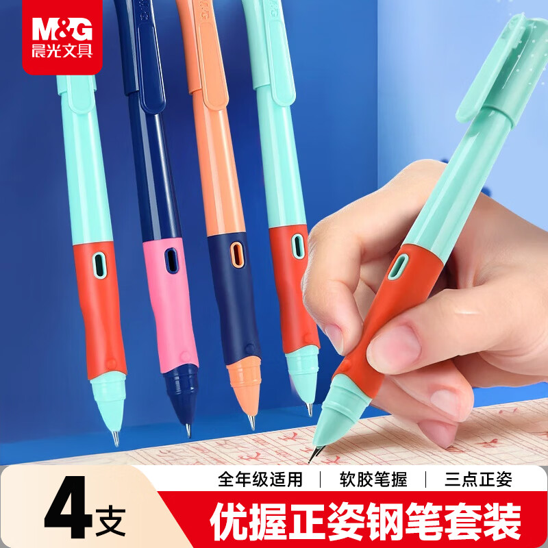 晨光(M&G)文具优握可擦正姿钢笔3.4mm口径 学生儿童墨囊矫姿寒假写字笔(本品不含墨囊)4支装AFPM1305