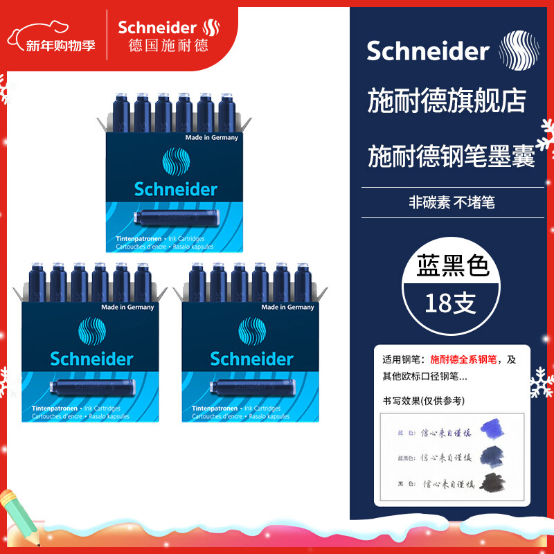 施耐德(Schneider)钢笔墨囊墨水胆非碳素不堵笔德国进口欧标钢笔适用3盒/18支装 蓝黑色6699