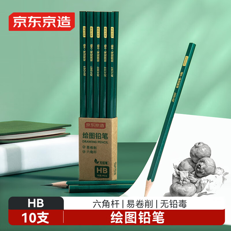 京东京造HB绿杆绘图铅笔10支装 经典六角原木木杆铅笔 儿童学生考试美术绘画素描写字练字开学文具