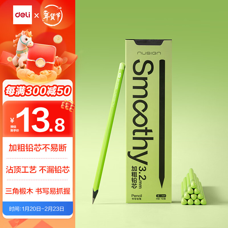 纽赛(NUSIGN)小绿杆三角杆铅笔 绿色护眼黑木学生考试素描绘图练字 10支NS743-HB【热门商品】得力旗下高端品牌