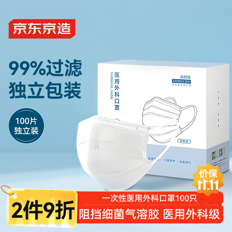京东京造一次性医用外科口罩100只独立包装 防尘防花粉防晒面罩白色