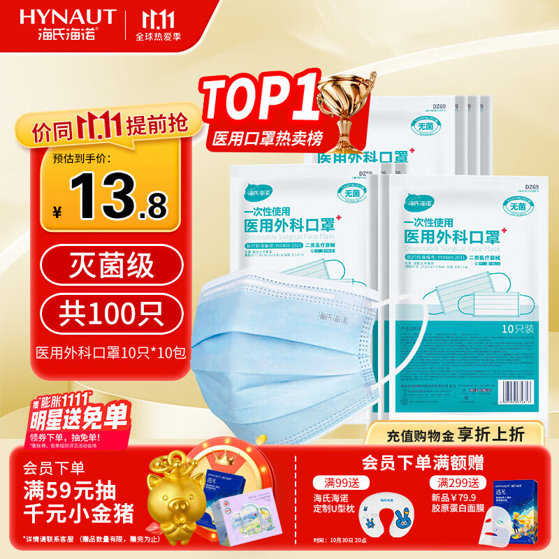 海氏海诺 一次性使用医用外科口罩100只 无菌三层防尘成人灭菌级防晒口罩