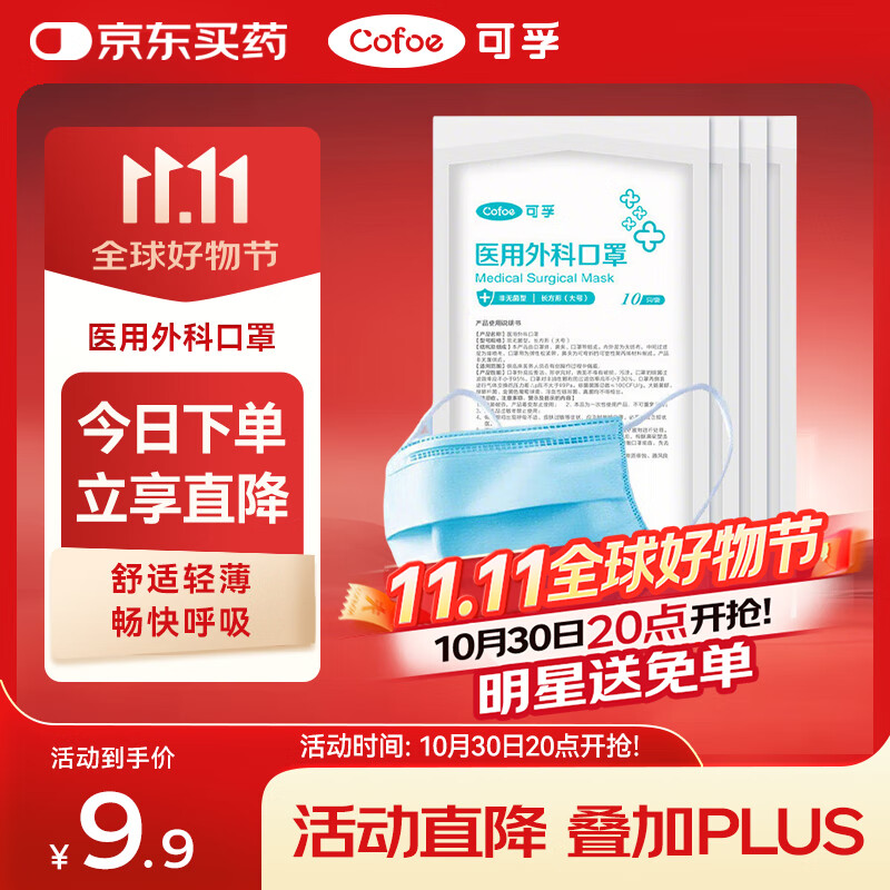 可孚 医用一次性外科口罩成人三层防护防尘防晒透气夏季轻薄 共50只装