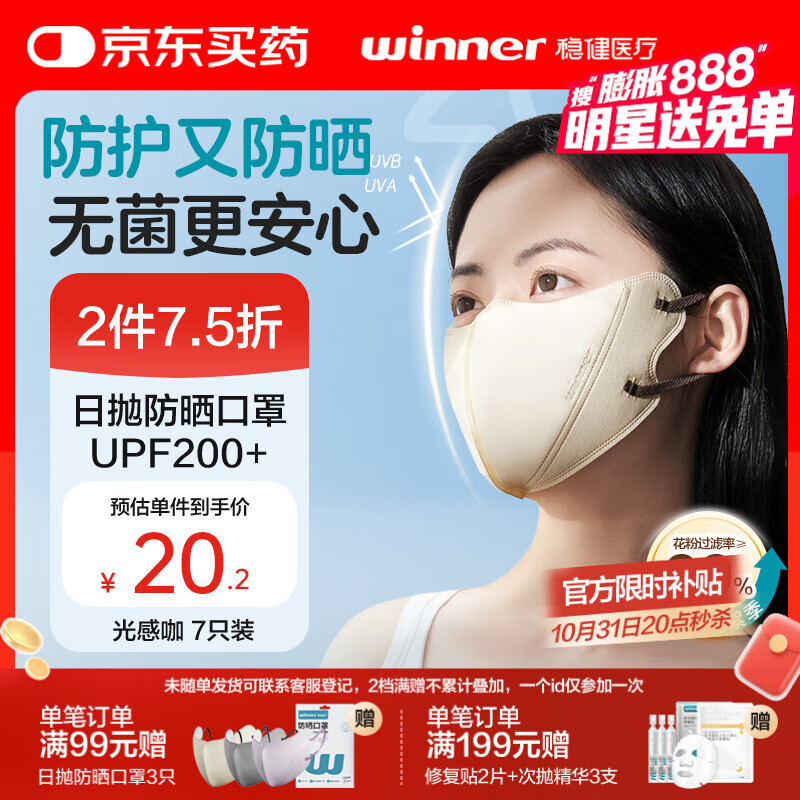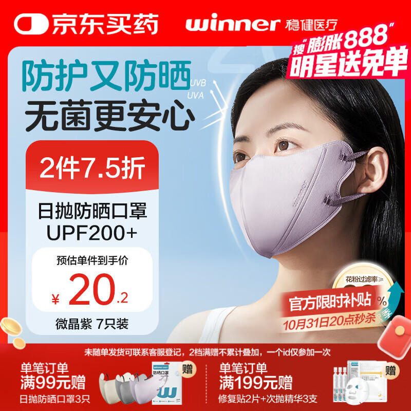 稳健一次性口罩灭菌级UPF200+防紫外线防晒面罩3只体验装