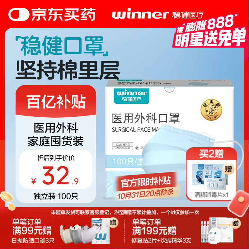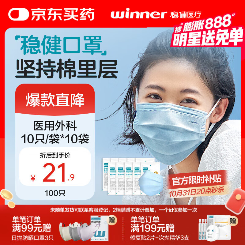 稳健一次性医用外科口罩100只独立装棉里层亲肤透气防过敏防尘防晒