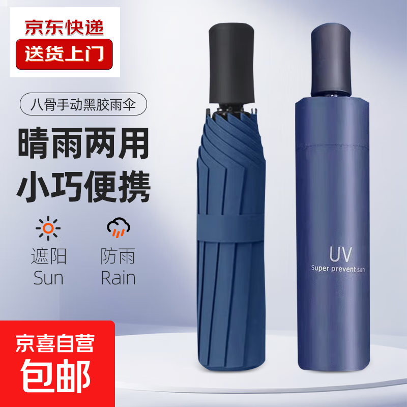 【晴雨两用】手动UV折叠黑胶防晒防外线紫遮阳雨伞 【手动款8骨】藏青UV