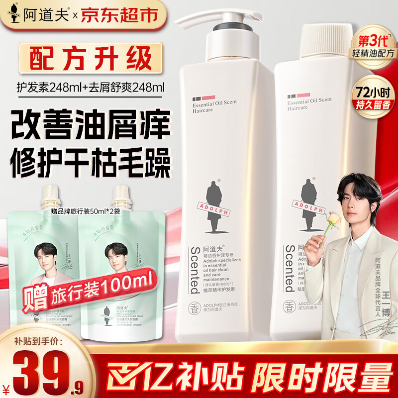 阿道夫洗发水精油香氛洗发露控油蓬松去屑舒缓柔顺留香乳液洗头膏男女士 祛屑洗发248ml+护发素248ml【洗护套装】 洗发水