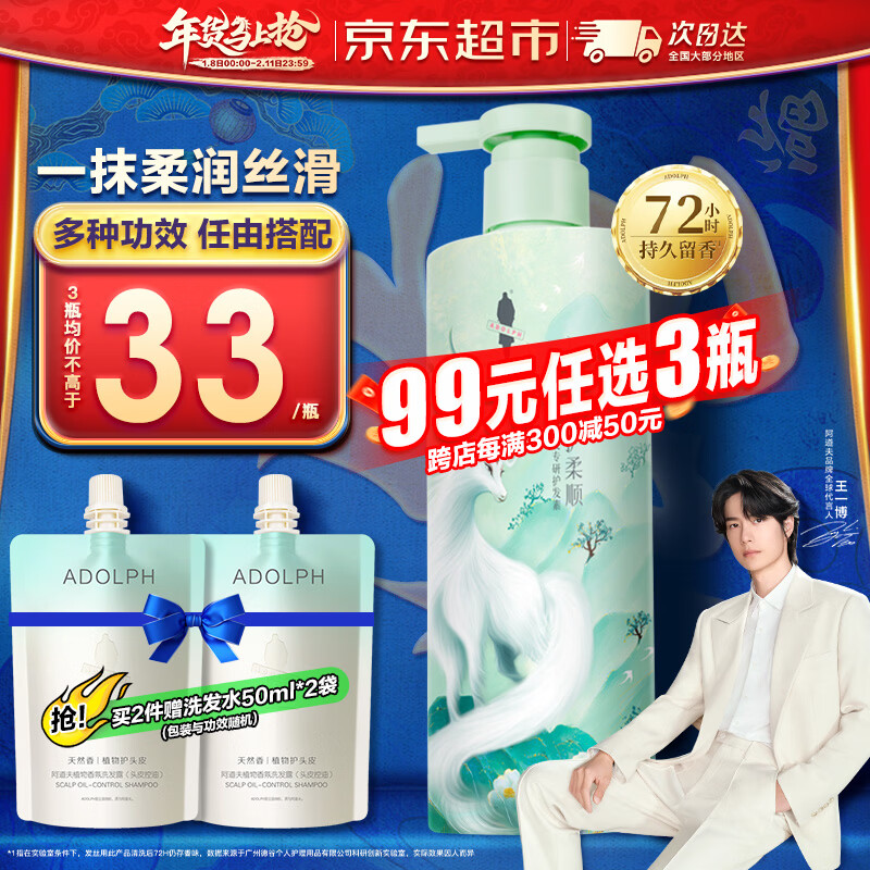 阿道夫植物香氛洗发水400ml 控油去屑蓬松洗头膏乳液 男士女士通用 植物柔滑护发素400ml 植物香氛