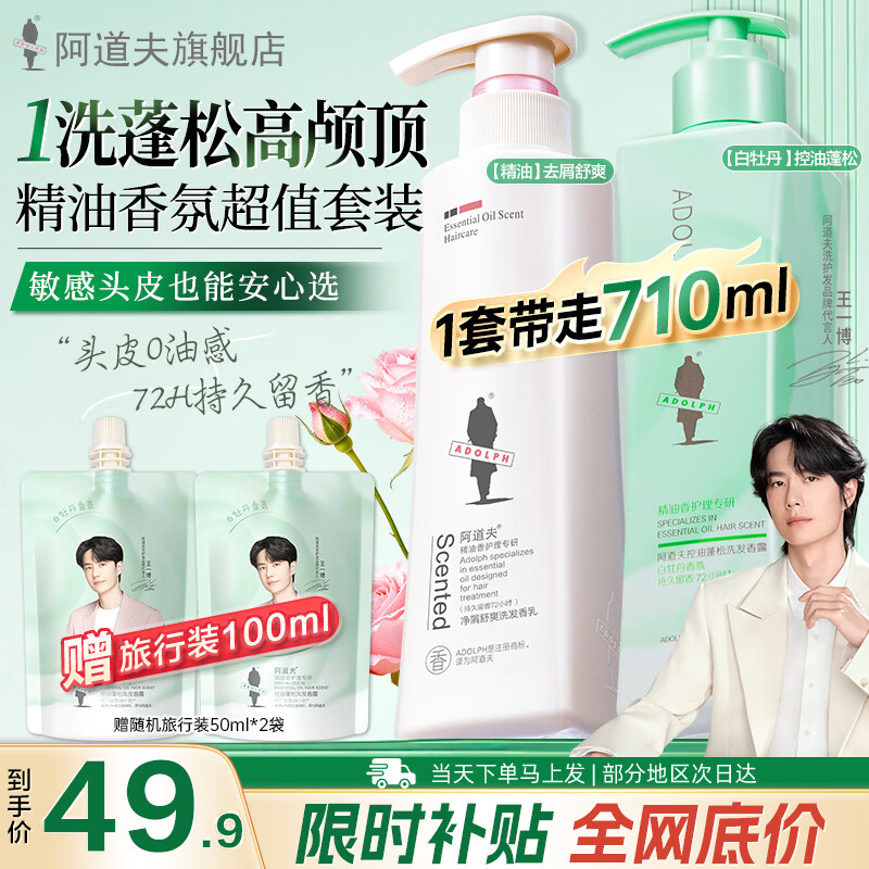 阿道夫白牡丹精油洗发水套装 控油去屑蓬松洗发露留香洗头膏 沐浴男女士 白牡丹控油300ml+精油祛屑洗发310ml