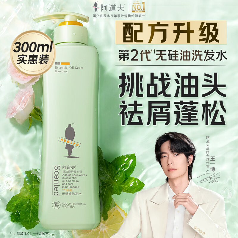 阿道夫无硅油洗发水300ml 清爽控油蓬松洗发露 控油舒缓去屑修护洗头膏