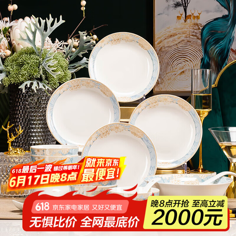 洛威大好河山62件景德镇陶瓷餐具套装碗碟套装家用乔迁新居碗盘套装