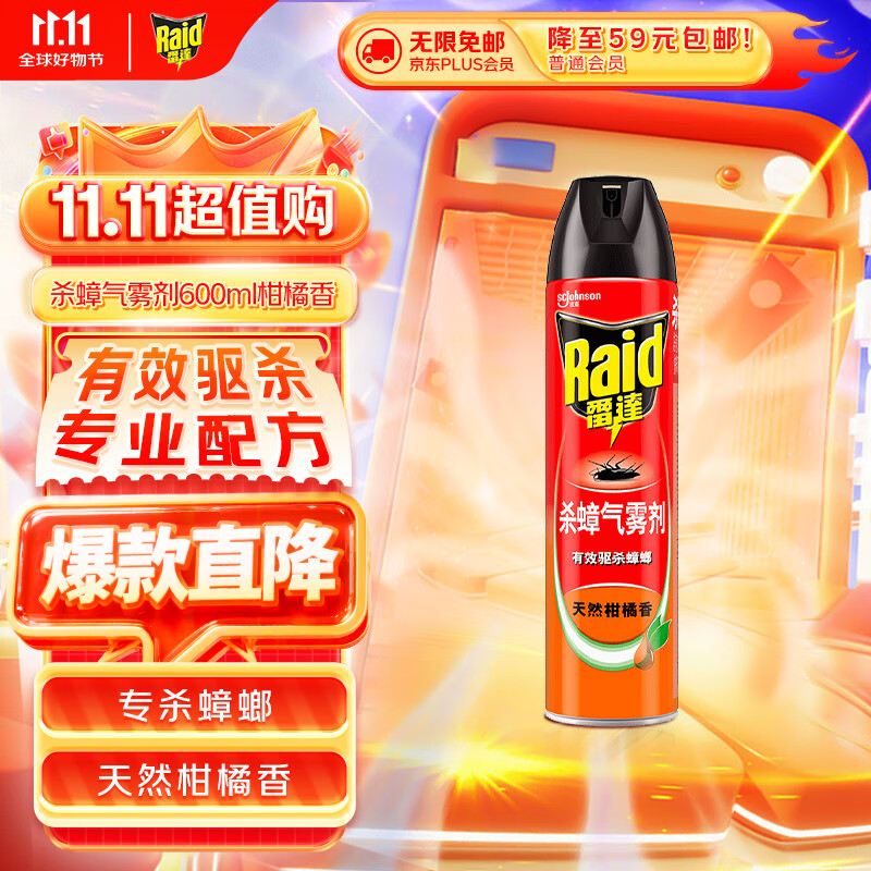 雷达(Raid) 杀蟑剂喷雾 600ml 天然柑橘香型 杀虫剂喷雾 杀虫气雾剂
