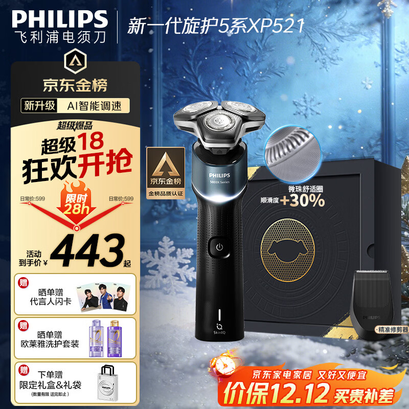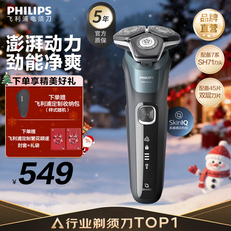 飞利浦(PHILIPS)电动剃须刀经典5系 闪电系列智能刮胡刀 圣诞节礼物送老公送男友 父亲生日礼物 国家补贴