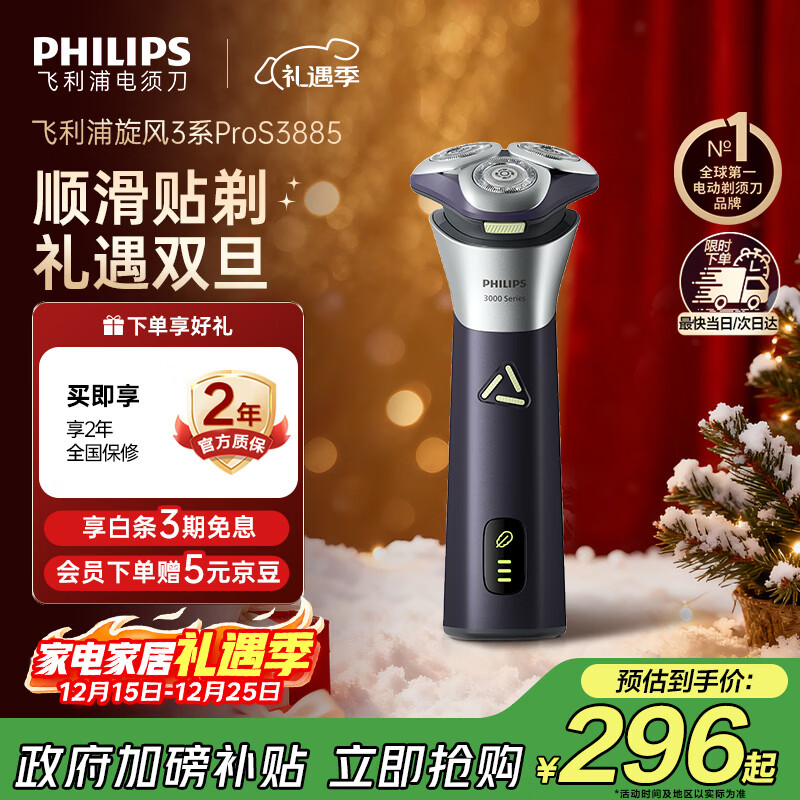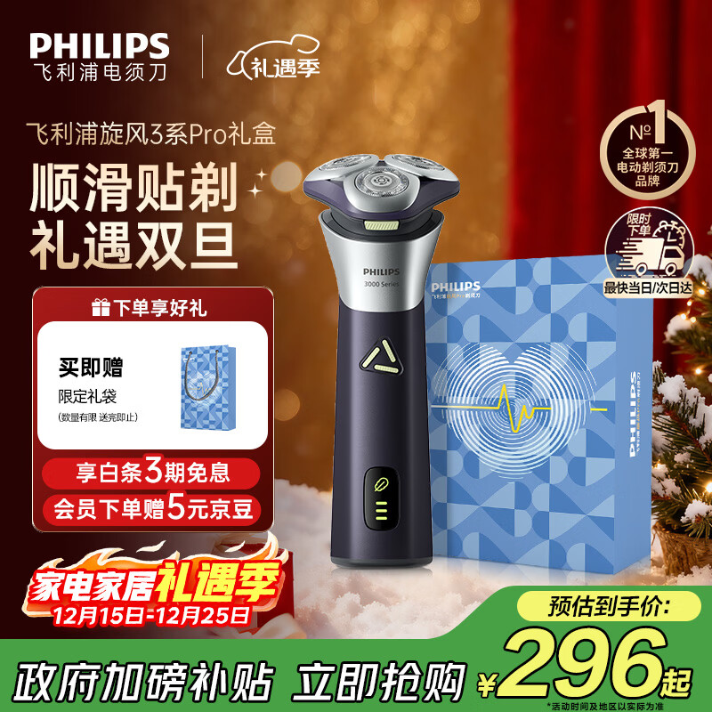 飞利浦(PHILIPS)电动剃须刀旋风3系PRO刮胡刀礼盒 风驰切剃6D浮动刀头 生日圣诞节礼物送老公男友父亲 国家补贴