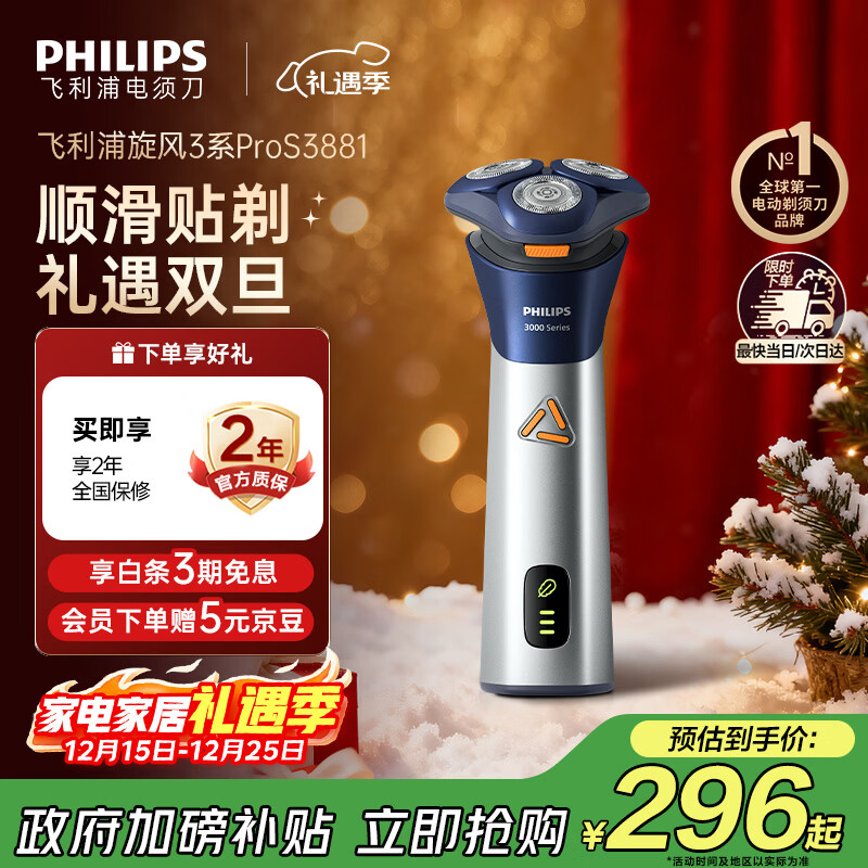 飞利浦(PHILIPS)【圣诞节礼物】剃须刀电动男士刮胡刀 进口刀头胡须刀全身水洗干湿两用电须刀须刨送男友礼物 升级新1系S1881【亲肤闪充 更久续航】