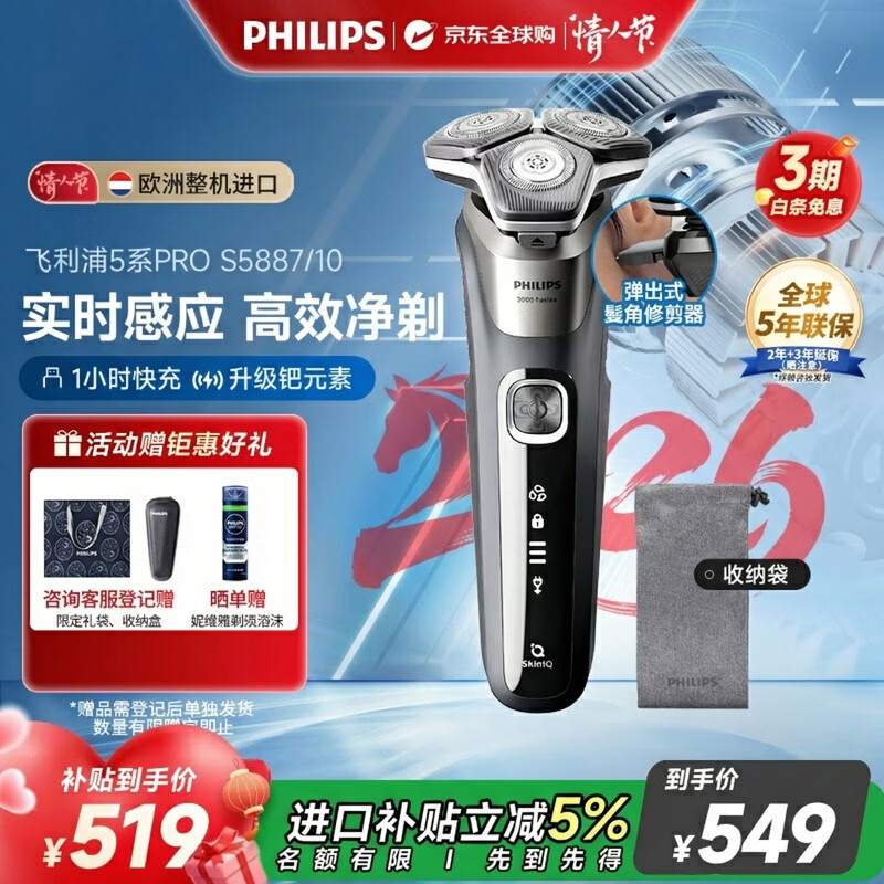 飞利浦(PHILIPS)电动剃须刀欧洲整机进口 旋护5系Pro SkinIQ系列 清爽净剃AI刮胡刀 情人节生日礼物送男友S5887/10