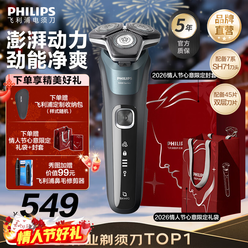 飞利浦(PHILIPS)电动剃须刀经典5系Pro京东金榜剃须刀 清爽净剃AI智能刮胡刀 情人节生日礼物送男生老公父亲