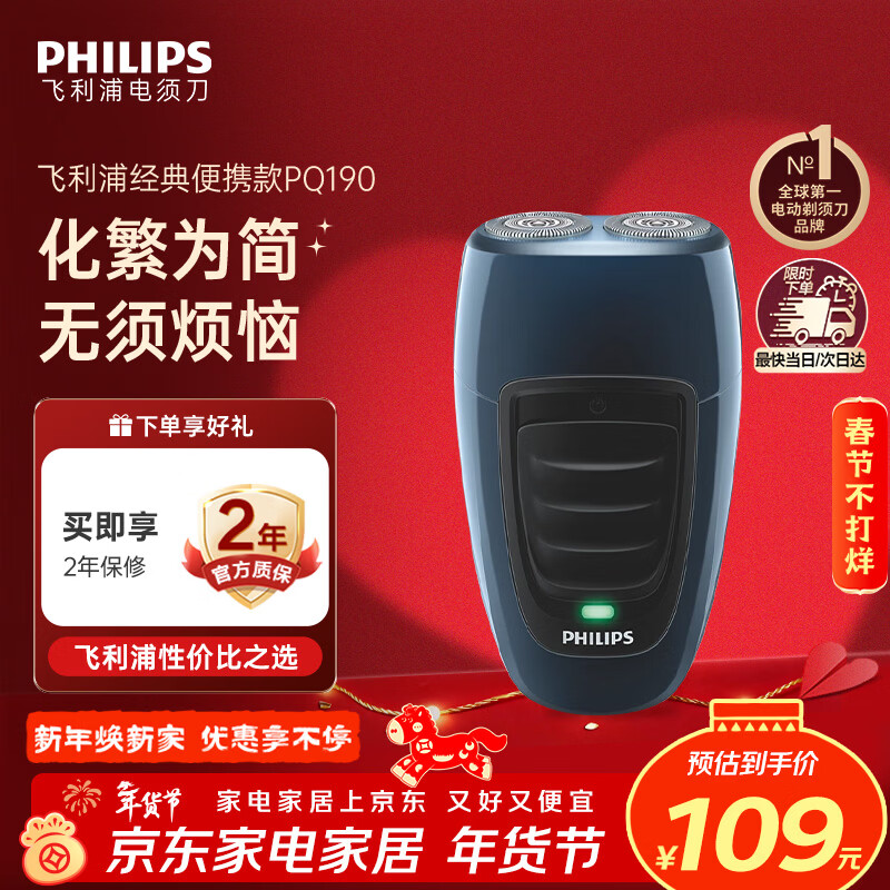 飞利浦(PHILIPS)电动剃须刀经典便携款 自研磨刀片刮胡刀 情人节生日礼物送男生老公父亲PQ190/16 出行必备