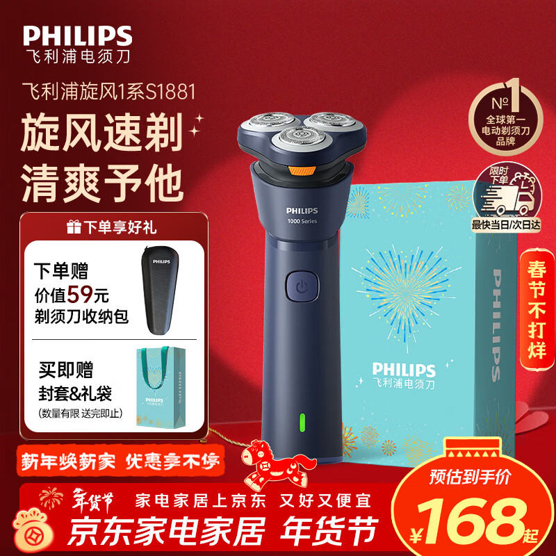 飞利浦(PHILIPS)【年会礼品】剃须刀电动男士刮胡刀 进口刀头胡须刀全身水洗干湿两用电须刀须刨送男友礼物 升级新1系S1881【亲肤闪充 更久续航】