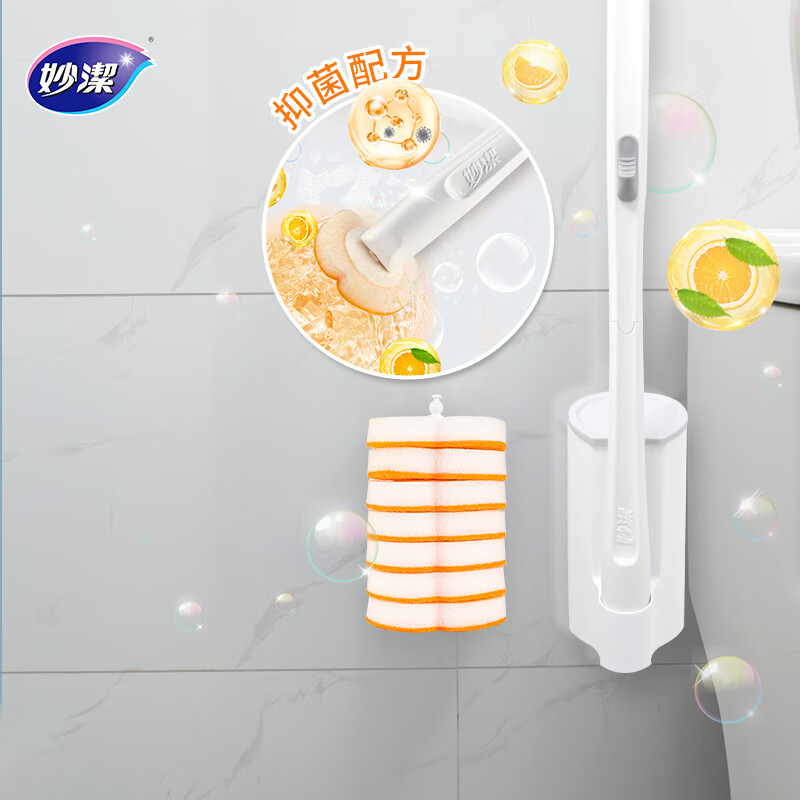 妙洁 一次性马桶刷 含本体共7个替换头 可壁挂 即用即抛 橘油去污
