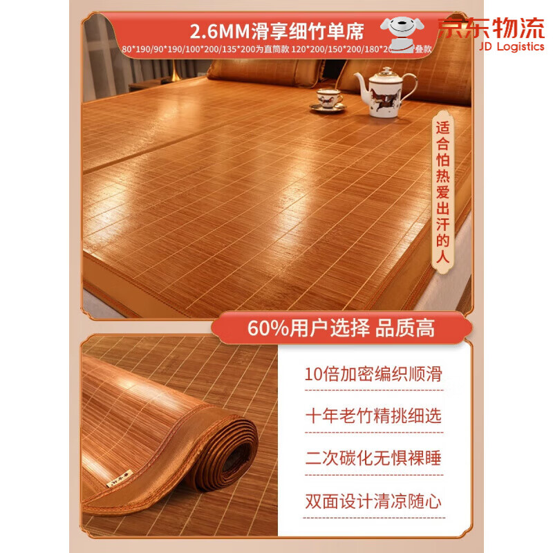 黄古林凉席碳化竹席夏季冰丝席草席夏天可折叠冬夏两用双面席子 2.6MM细竹床席款丨单件竹席丨十1
