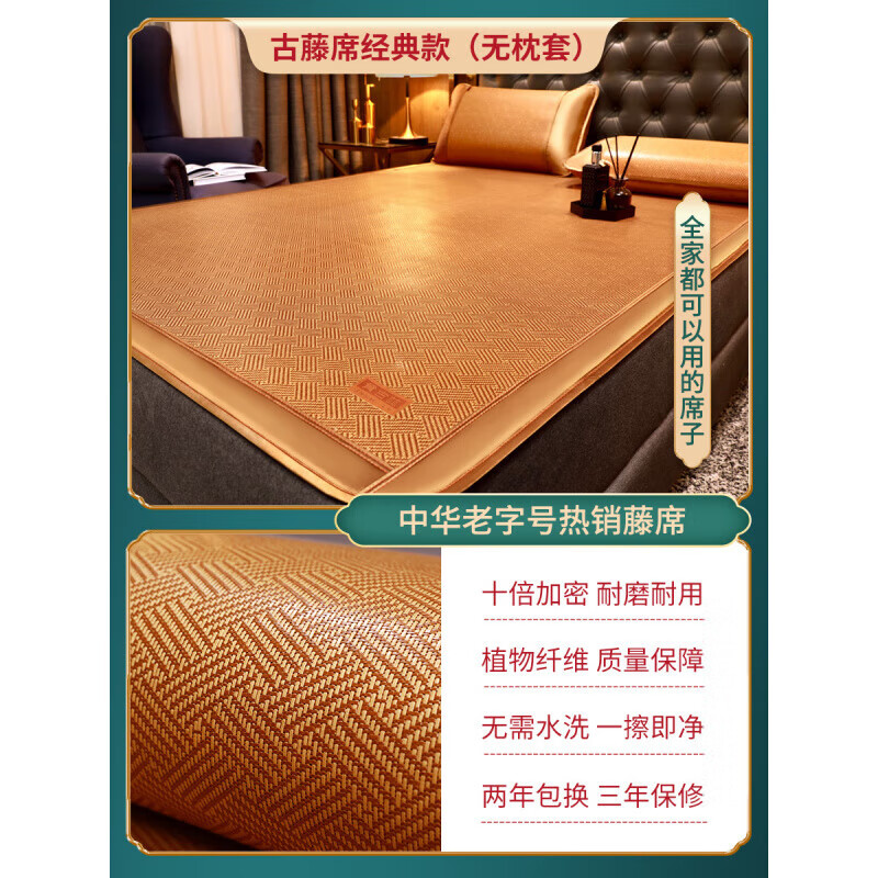 黄古林经典古藤席三件套升级加厚冰丝双面席双人床凉席床笠款席子单人席 母婴A类-经典单面款(无枕套) 1.8米床(180*200cm)