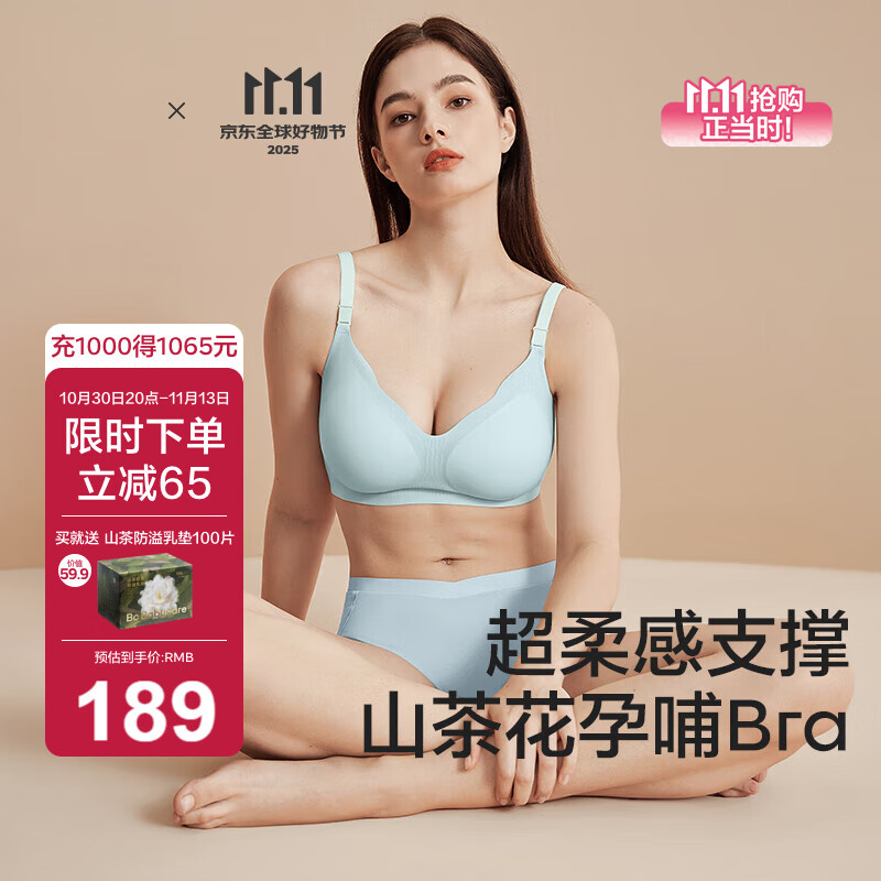 babycare山茶花哺乳文胸孕妇哺乳内衣聚拢防下垂收副乳怀孕期专用浮雕蓝XL