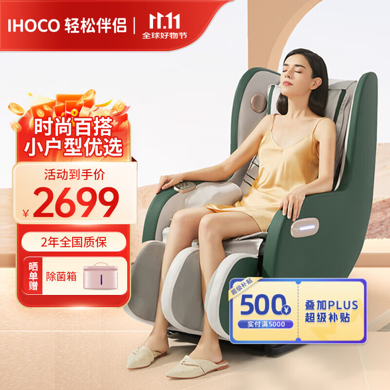 ihoco轻松伴侣按摩椅家用电动全身头等舱智能太空舱豪华尊享颈椎肩颈腰豪华小型小巧轻便沙发3D机芯6699 菘蓝绿