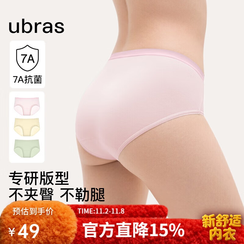 ubras【纯棉】7A抗菌裆透气舒适女士内裤女中腰三角裤(3条装)