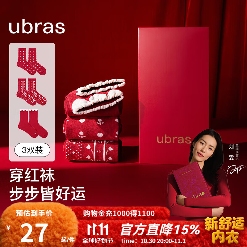 ubras本命年结婚礼物小小心意新疆棉女中筒袜碎花元气红袜子女 多色组合 3双 均码 U